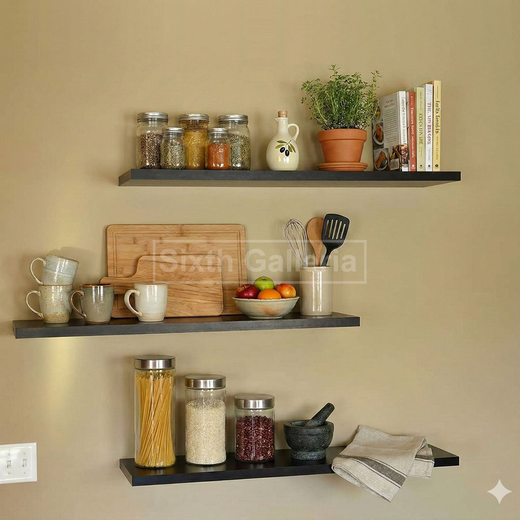 A set of 3 Floating wall shelves in Black color, which will decorate any wall and will also provide a lot of extra storage space. Decorate your home or office in an elegant and modern way with our floating shelves.